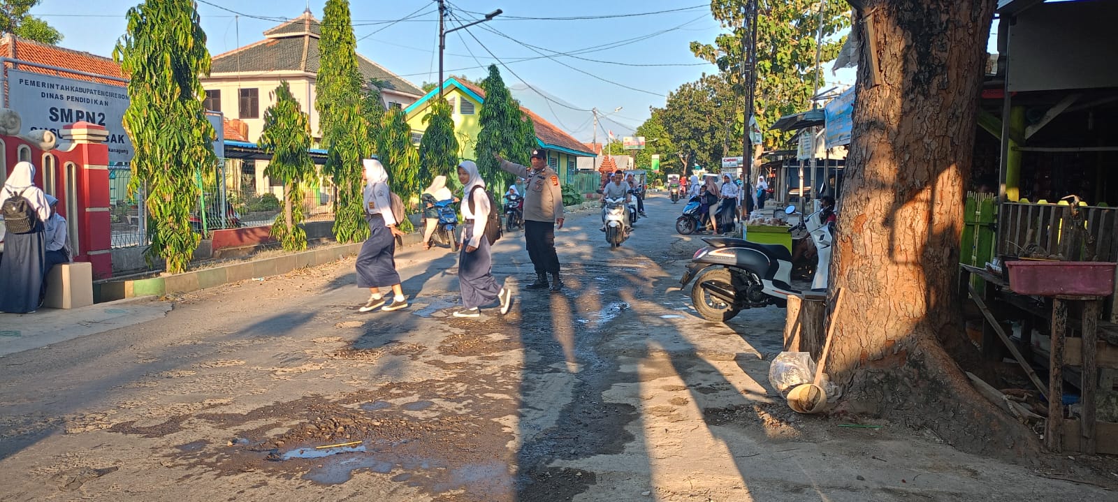 Jajaran Personil Polsek Susukan lebak Polresta Cirebon melaksanakan Gatur Lalu lintas pagi di Jalan raya Susukan lebak depan SMPN2 Susukan lebak Ds. Susukan agung Kec. Susukan lebak Kab. Cirebon.