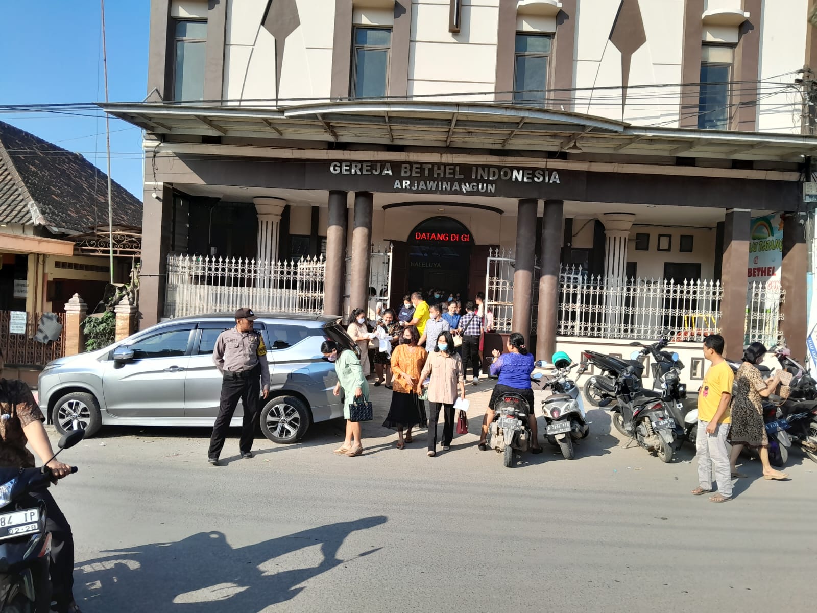 CIREBON – Berlangsungnya kegiatan kebaktian di gereja GBI ( Gereja Bethel Indonesia) Arjawinangun pada pagi hari di mana lokasi gereja tersebut terletak di jalan kantor Pos Arjawinangun, guna menciptakan Kamtibmas aman pada saat berlangsung kegiatan tersebut Polsek Arjawinangun melaksanakan pengamanan guna memberikan rasa aman kepada umat Nasrani yang sedang melaksanakan ibadah kebaktian malam di gereja GBI tersebut.