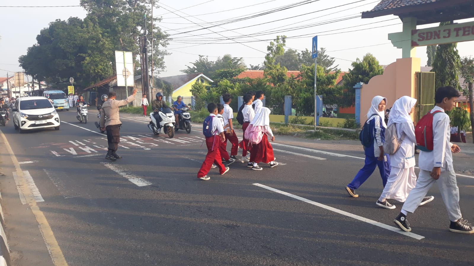 Personil Polsek Plered melaksanakan Gatur Lalu lintas pagi di Jln. Otista tepatnya depan SDN 3 Tegalsari dan SMP N 2 Plered Ds. Tegalsari Kecamatan Plered Kabupaten Cirebon.