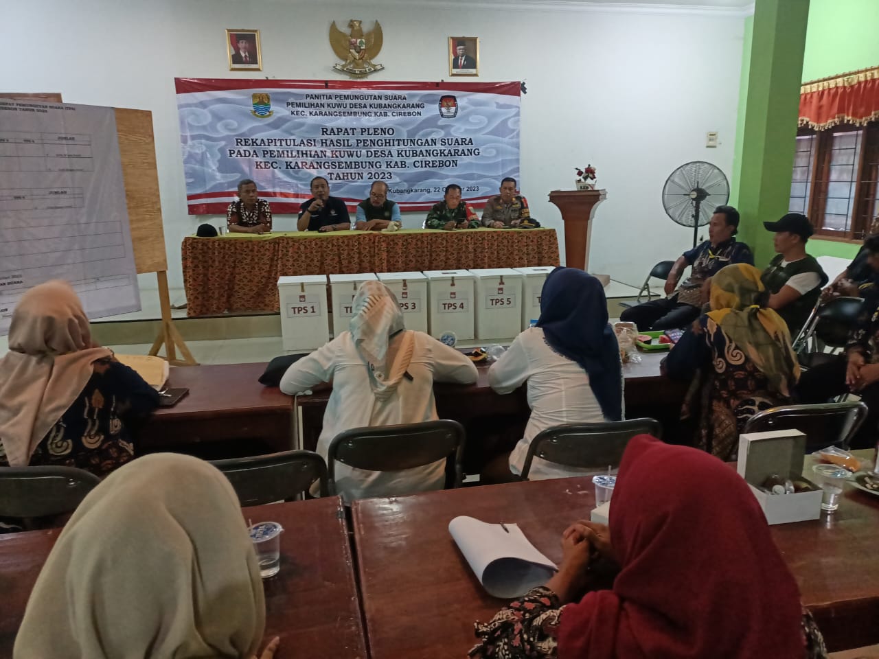Pemilihan Kepala Desa secara serentak untuk wilayah Kab. Cirebon hari ini telah di laksanakan kemarin, dan berjalan aman dan kondusif, untuk itu tadi malam Muspika Kecamatan karangsembung dalam hal ini Camat, Kapolsek serta Danramil selaku tim pengawas pilkuwu menghadiri rapat pleno rekapitulasi suara pilwu di Desa kubangkarang. Minggu malam (22/10/2023)