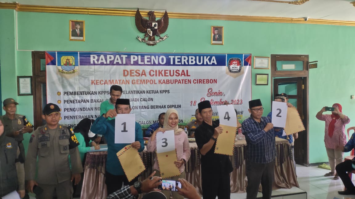 Pengundian nomor urut calon Kuwu/Kepala Desa Cikeusal Kecamatan Gempol Kabupaten Cirebon pada pemilihan calon kuwu serentak 2023 yakni Nomor Urut 1 Sdr. IWAN SETIAWAN., Nomor Urut 2 Sdr. DEDI KARSONO., Nomor Urut 3 Sdri. MARYATI dan Nomor Urut 4 Sdr. KARSIJA.