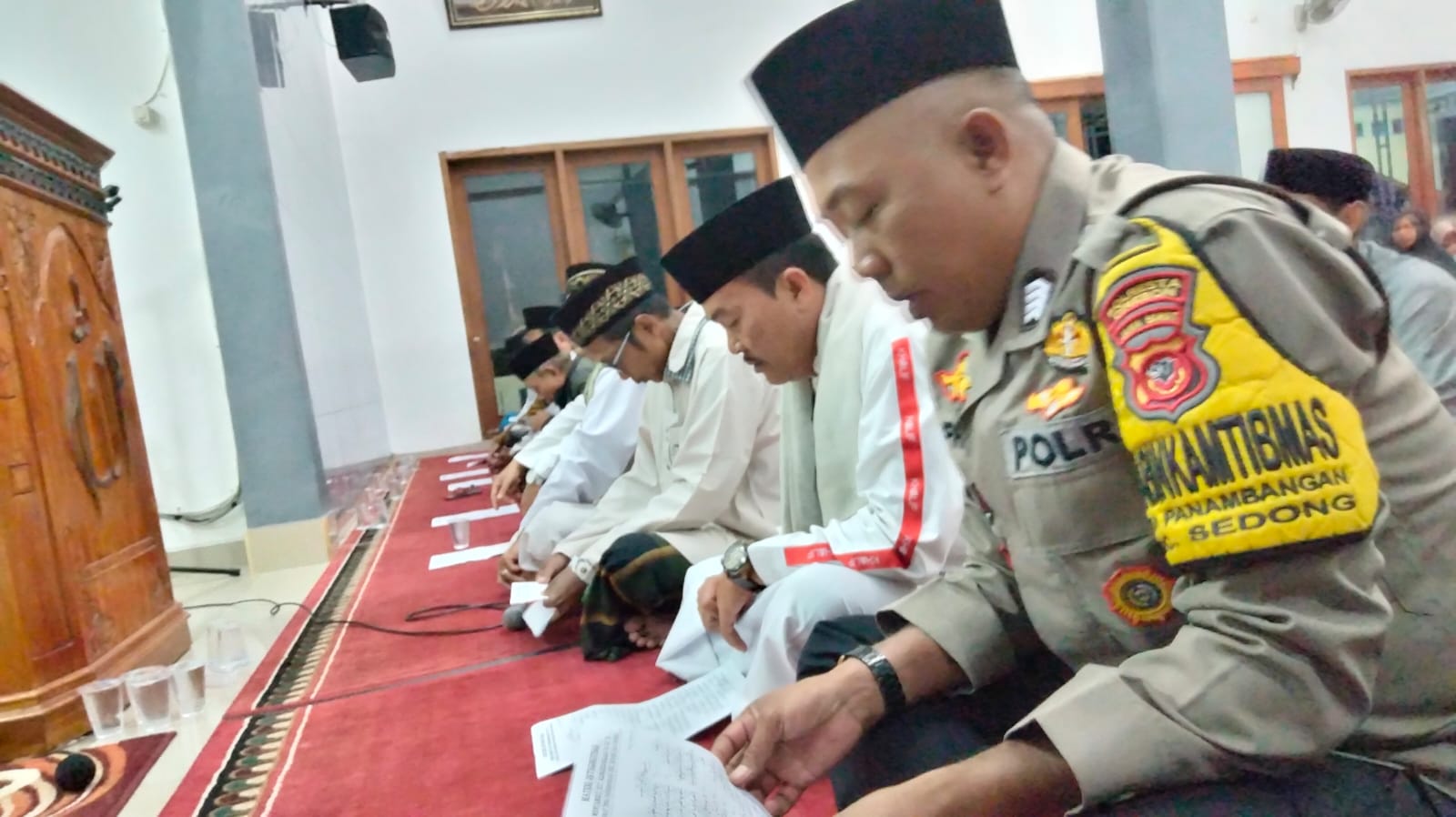 Sedong – Bripka Supriadi Bhabinkamtibmas Desa Panambangan menghadiri giat Istighosah di Masjid Mujahidin Desa Panambangan Kecamatan Sedong Kabupaten Cirebon.