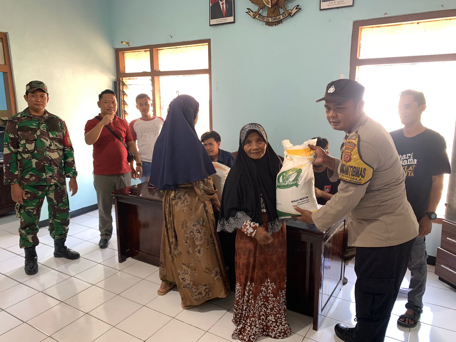 Kab. Cirebon – Bhabinkamtibmas Desa Mandala Polsek Dukupuntang Polresta Cirebon Aipda Tono Hartono bersama dengan Babinsa Desa Mandala Serda Eko Sulistyono melaksanakan giat monitoring Penyaluran Bantuan Pangan Ta. 2023, untuk warga yang kurang mampu di Desa Mandala Kecamatan Dukupuntang Kabupaten Cirebon, Sabtu (10/06/2023)