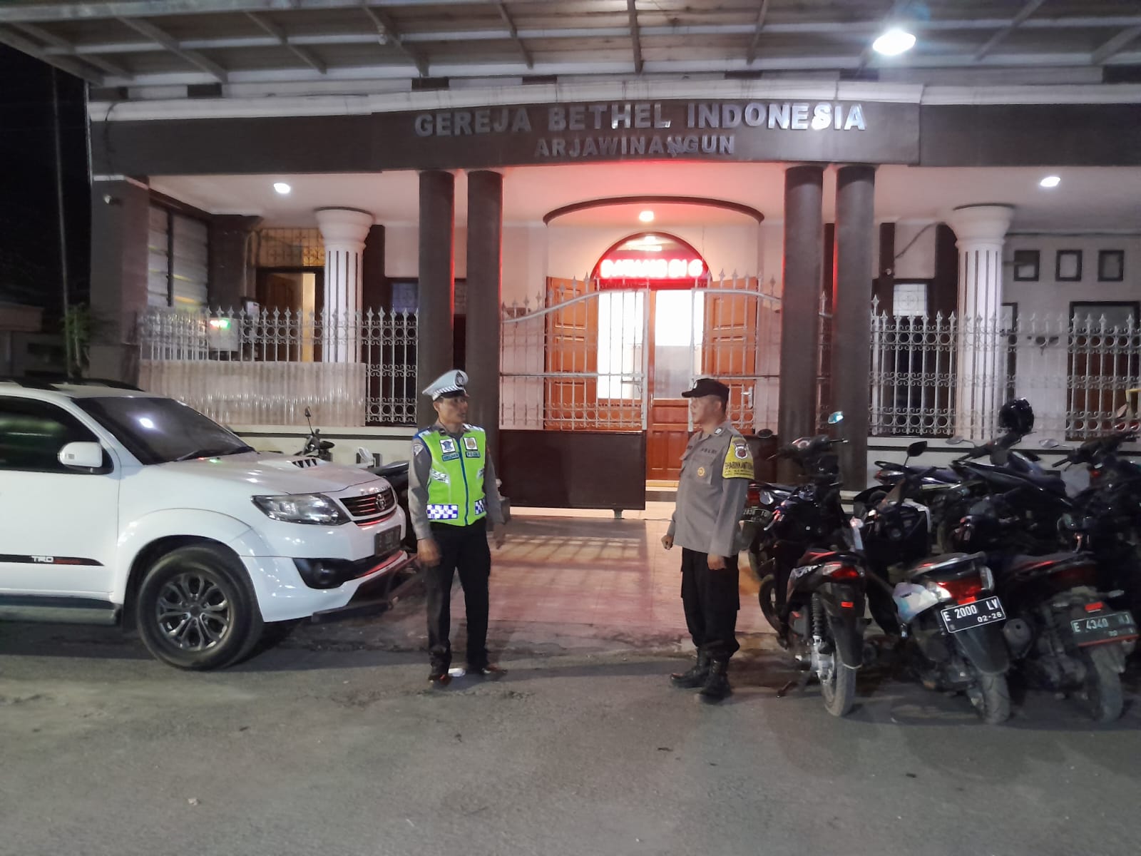 KAB. CIREBON – Cegah gangguan Kamtibmas pada malam hari Polsek Arjawinangun Polresta Cirebon melaksanakan  pengamanan  kebaktian ibadah Raya 2 di gereja GBI Arjawinangun, adapun dalam kegiatan tersebut  untuk  memberikan rasa aman kepada umat Nasrani yang sedang melaksanakan kebaktian  ibadah Raya 2.