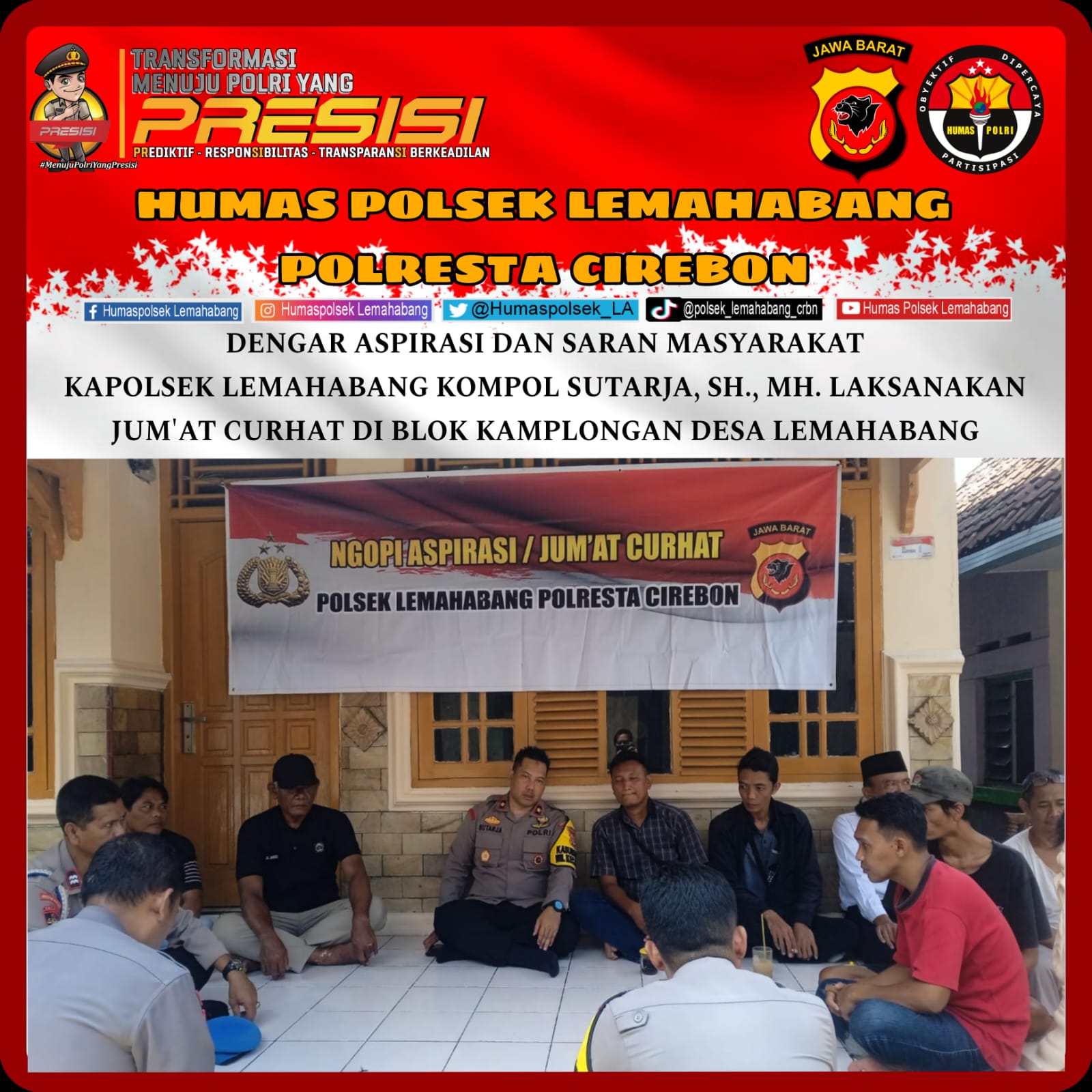 Lemahabang, Crb – Kapolsek Lemahabang Kompol Sutarja, SH., MH. bersama para Kanit dan anggota Polsek Lemahabang menggelar jumat curhat / ngopi Aspirasi di Blok Kamplongan Desa Lemahabang Kecamatan Lemahabang Kabupaten Cirebon, hal ini bertujuan untuk mendengarkan keluhan, saran serta kritik dari masyarakat secara langsung, untuk membangun kinerja Polri yang lebih baik., Jumat (26/01/2024)