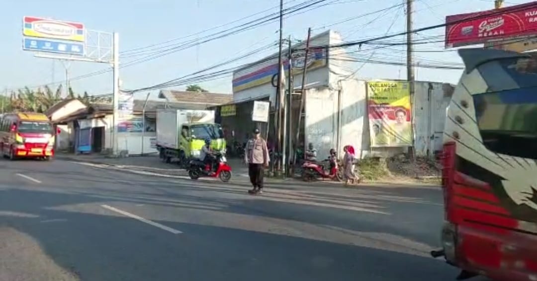 Personil Polsek Ciwaringin melaksanakan Gatur Lalu lintas di pagi hari di Jalan Cirebon- Bandung tetapnya di pertigaan Desa Ciwaringin Kecamatan Ciwaringin Kabupaten Cirebon.