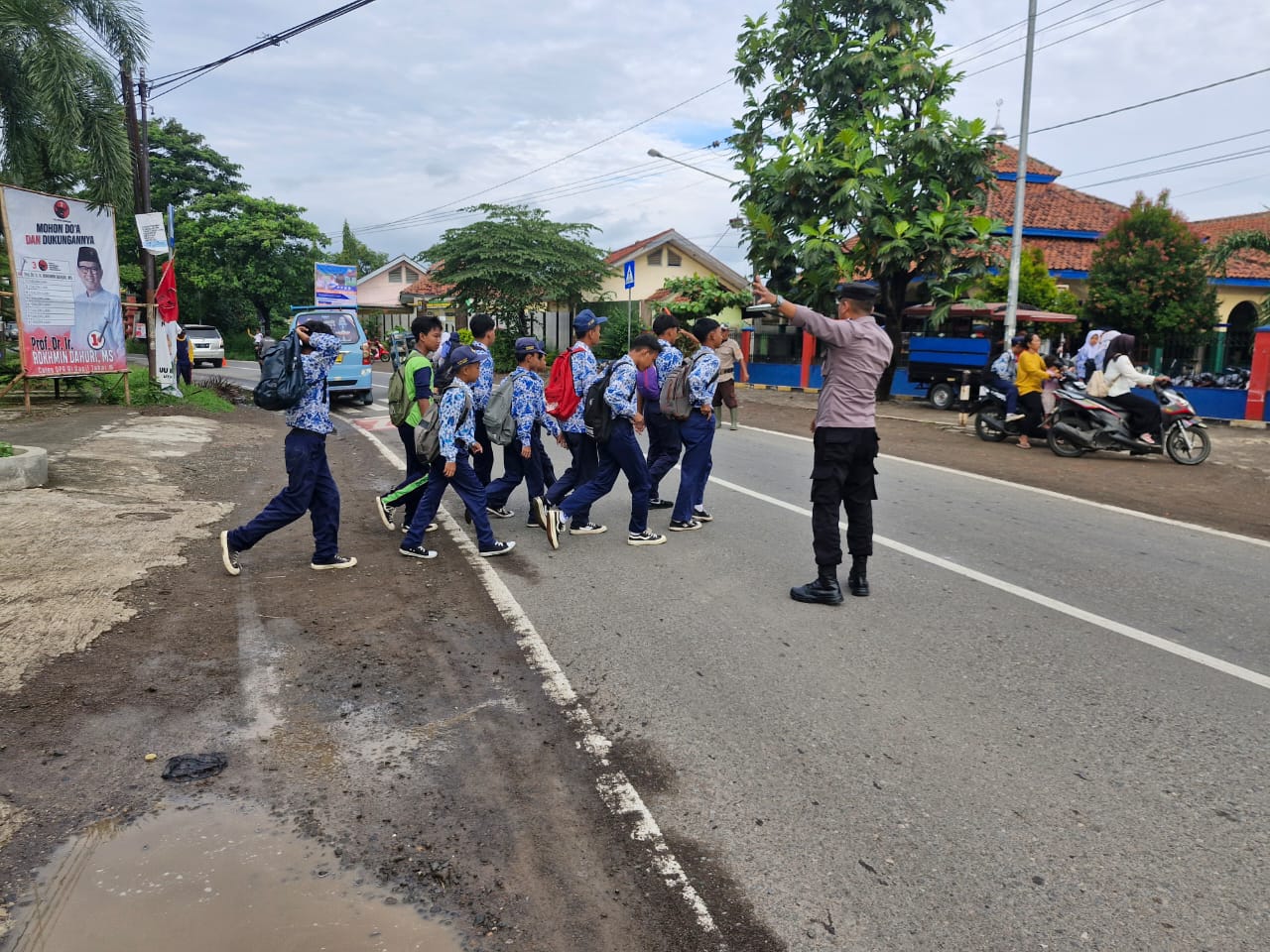 Personil Polsek Waled melaksanakan pengaturan Lalu lintas pagi di Kecamatan waled Kabupaten Cirebon.
