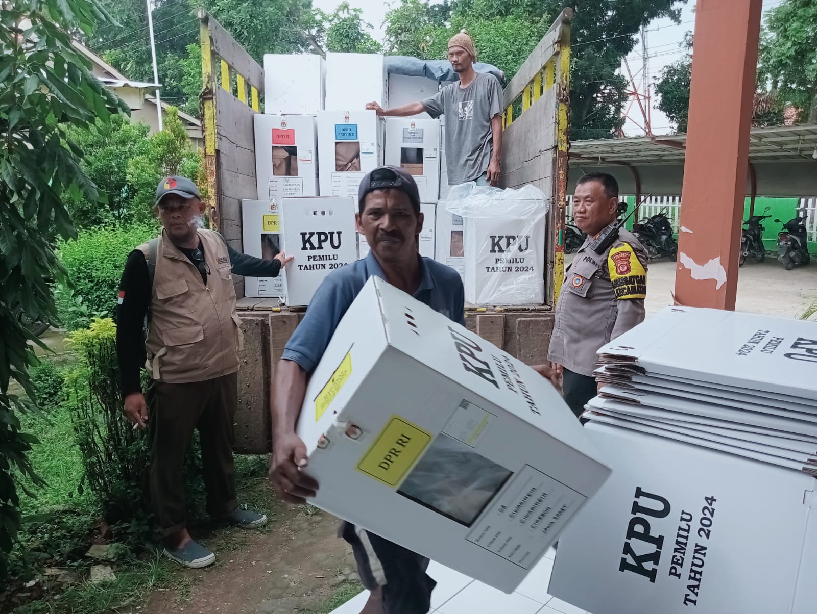 Ciwaringin – Dalam rangka menjaga keamanan perjalanan kotak suara dari PPS menuju penyimpanan gudang logistik PPK di Aula PGRI kecamatan Ciwaringin Kanit Binmas Polsek Ciwaringin Polresta Cirebon, melaksanakan pengawalan kotak suara hasil pencoblosan pada pemilu tahun 2024.Kamis (15/02/2024).