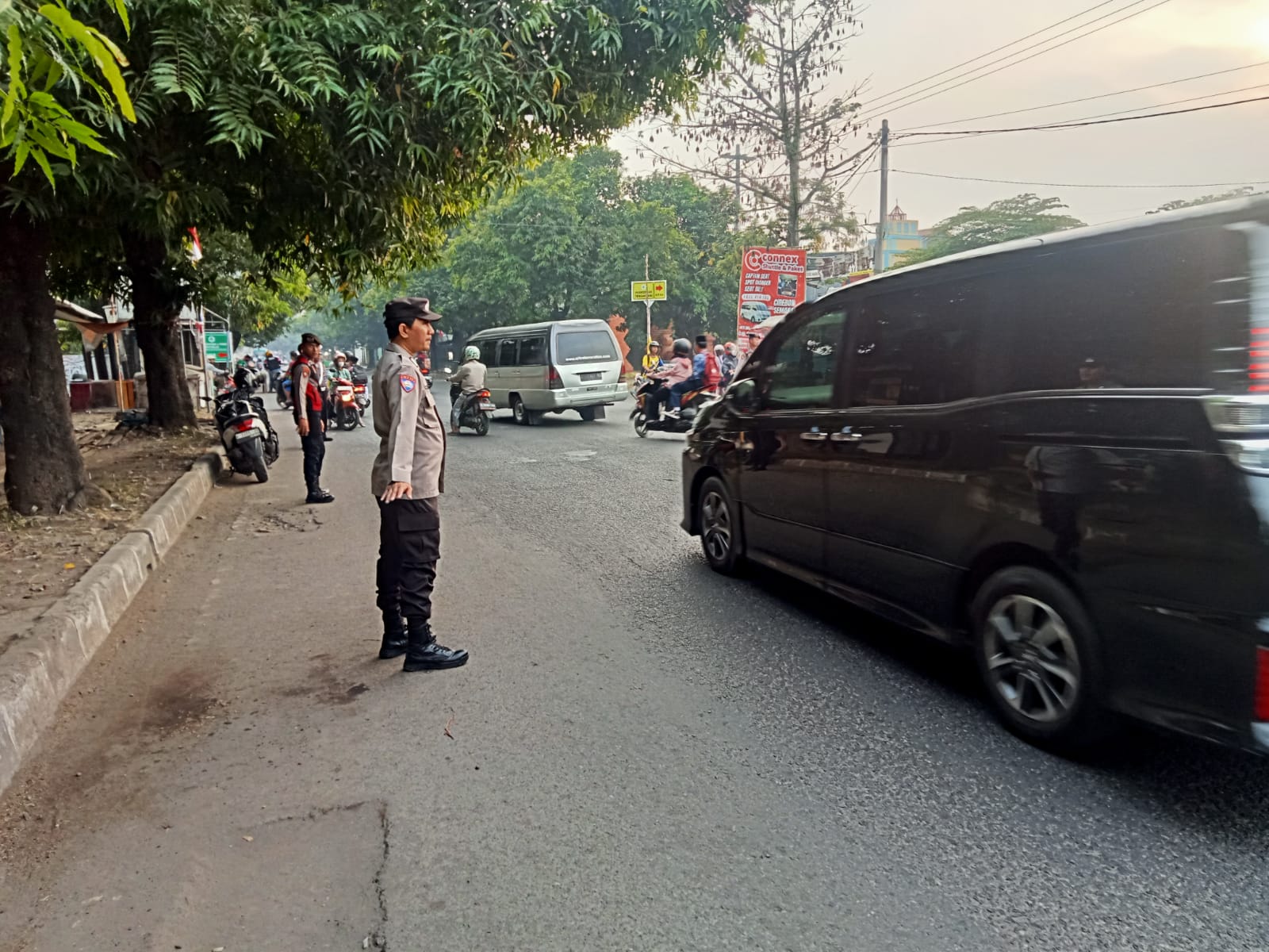 Jajaran Personil Polsek Sumber Polresta Cirebon Polda Jabar, melaksanakan Gatur Lalu lintas pagi di Pertigaan Jl. Ki Bagus Rangin kelurahan Watubelah Kec. Sumber Kab. Cirebon.