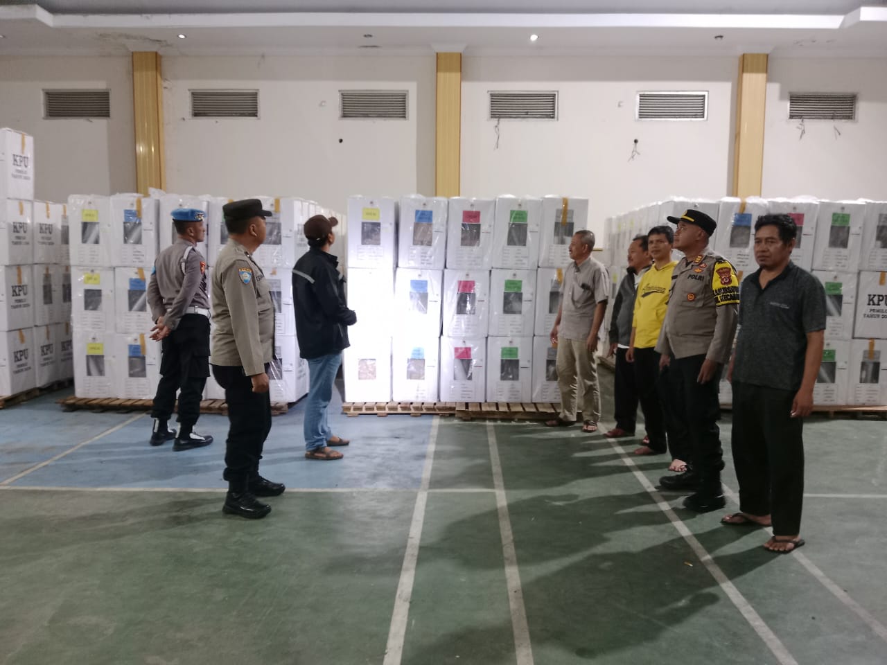 Cirebon – Sabtu malam (10/02/2024) Kapolsek Dukupuntang AKP Nuryana beserta anggota melakukan pengontrolan terhadap gudang logistik Pemilu Tahun 2024 PPK Dukupuntang yang berada di GOR Kartini Desa Bobos.