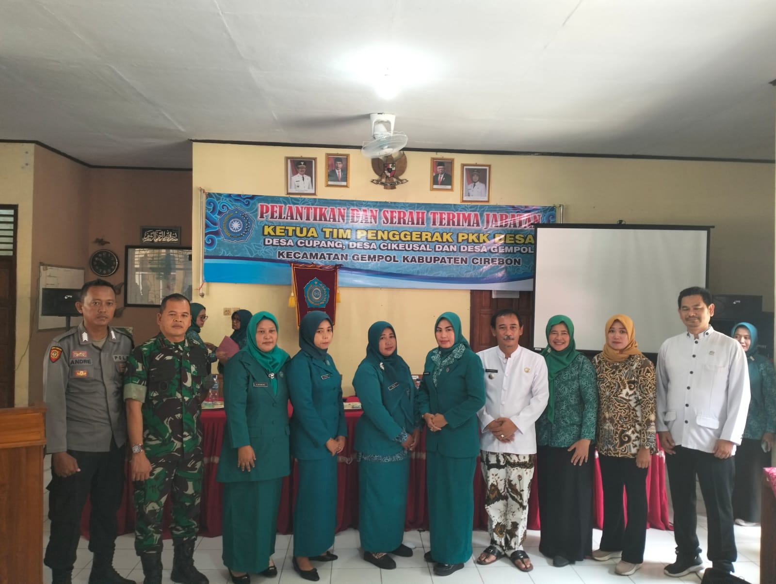 kegiiatan pelantikan dan serah terima jabatan Ketua Tim Penggerak PKK Desa Cikeusal, Desa Cupang dan Desa Gempol dihadiri Camat Gempol Bpk Sri Darmanto S.Sos. bersama Danramil 0620-16 / Gempol Kapten (Arm) Karsim, Kapolsek Gempol Kompol Munawan SH di wakili Bhabinkamtibmas Desa Gempol Bripka Suhono Andri serta Kader PKK Se’kecamatan Gempol.