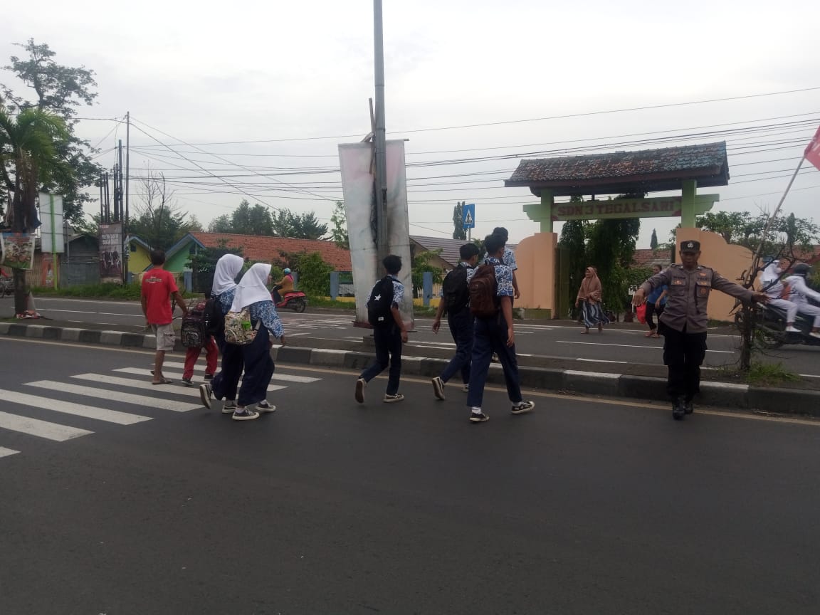 Anggota Polsek Plered melaksanakan Gatur Lalu lintas pagi di Jalan Otista di depan SDN 3 Tegalsari dan SMPN2 Plered Kec. Plered Kab. Cirebon