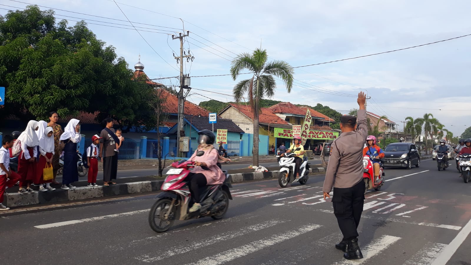 Personil Polsek Plered melaksanakan Gatur Lalu lintas pagi di Jln. Otista tepatnya depan SDN 3 Tegalsari dan SMP N 2 Plered Ds. Tegalsari Kecamatan Plered Kabupaten Cirebon.