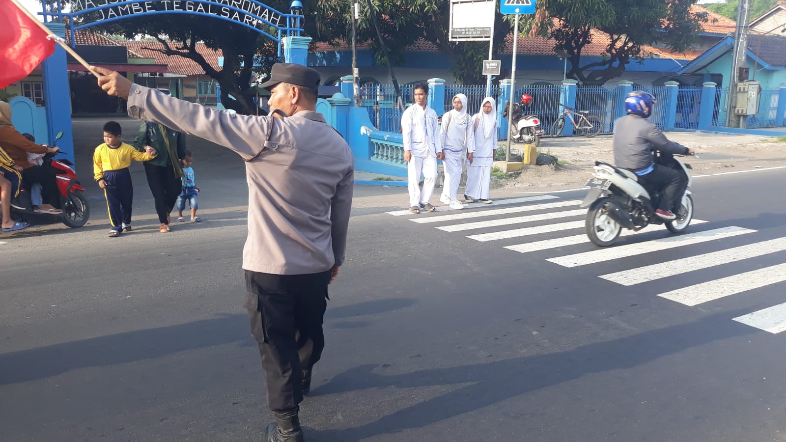 Anggota Polsek Plered melaksanakan Gatur Lalu lintas pagi di Jalan Otista di depan SDN 3 Tegalsari dan SMPN2 Plered Kec. Plered Kab. Cirebon.