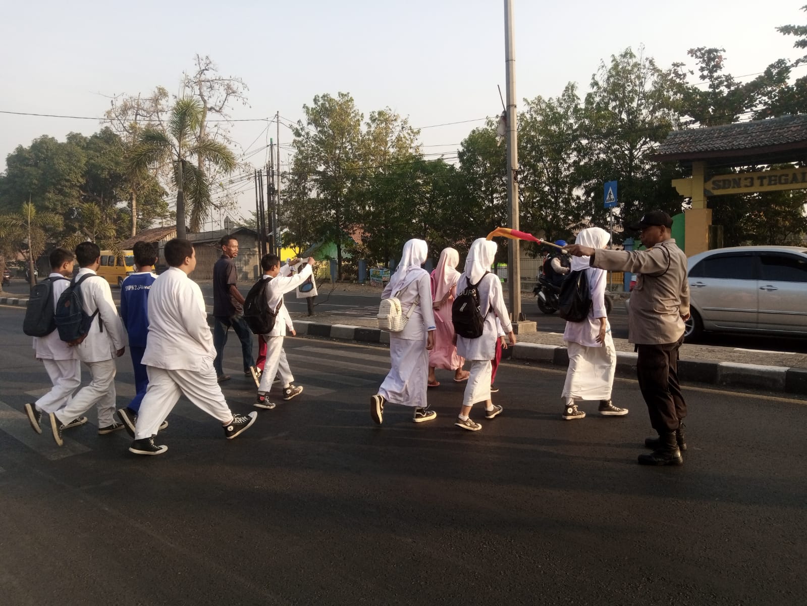 Personil Polsek Plered melaksanakan Gatur Lalu lintas pagi di Jln. Otista tepatnya depan SDN3 Tegalsari dan SMPN2 Plered Ds. Tegalsari Kecamatan Plered Kabupaten Cirebon.