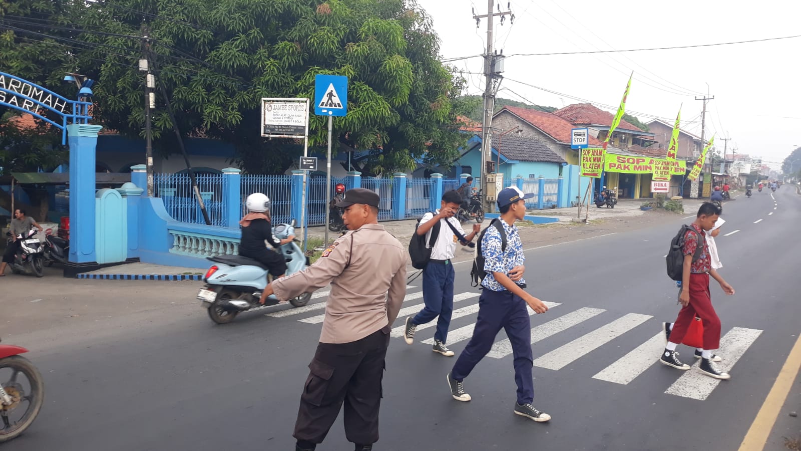 Personil Polsek Plered melaksanakan Gatur Lalu lintas pagi di Jln. Otista tepatnya depan SDN 3 Tegalsari dan SMP N 2 Plered Ds. Tegalsari Kecamatan Plered Kabupaten Cirebon.