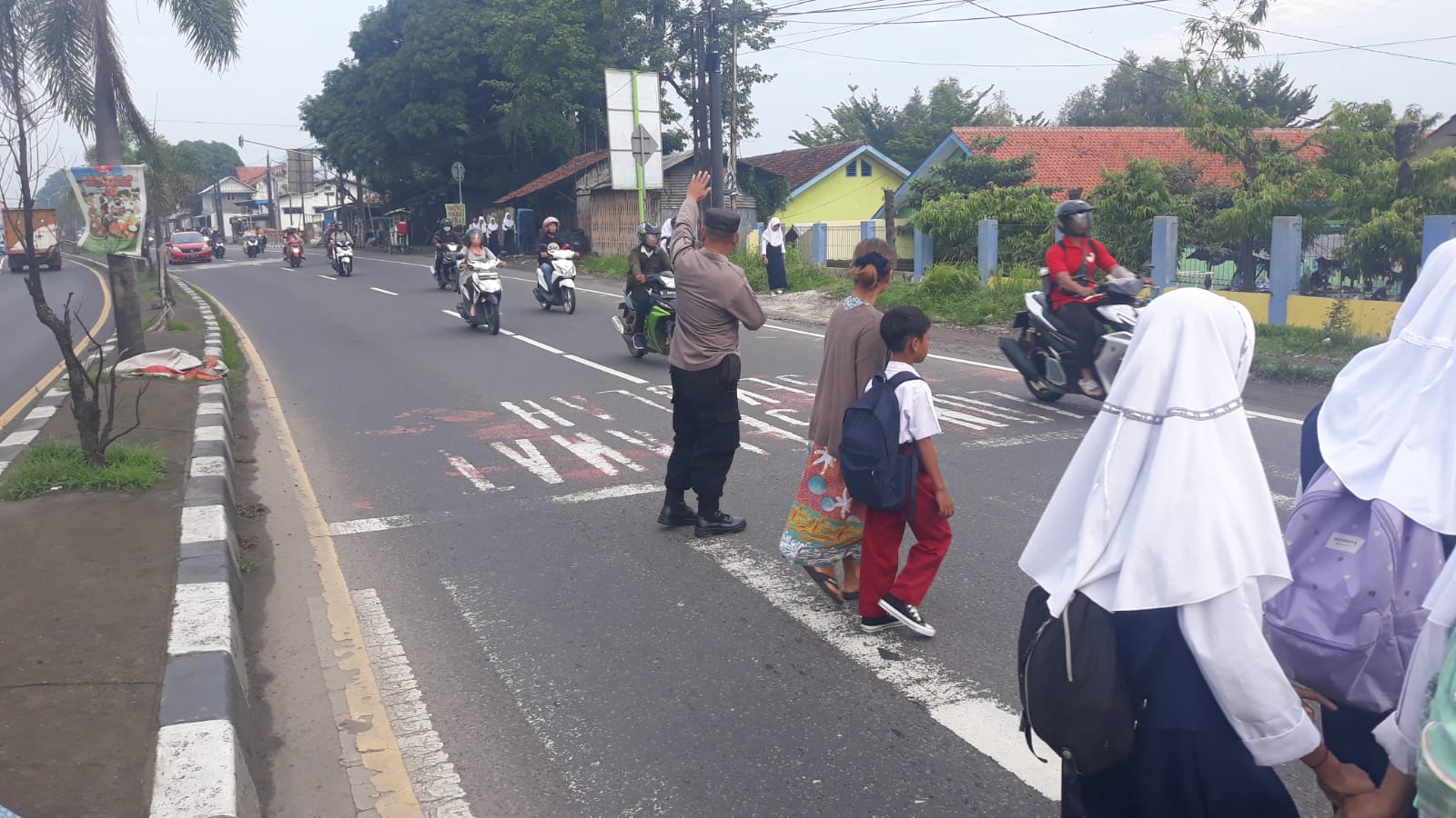Personil Polsek Plered melaksanakan Gatur Lalu lintas pagi di Jln. Otista tepatnya depan SDN 3 Tegalsari dan SMP N 2 Plered Ds. Tegalsari Kecamatan Plered Kabupaten Cirebon.