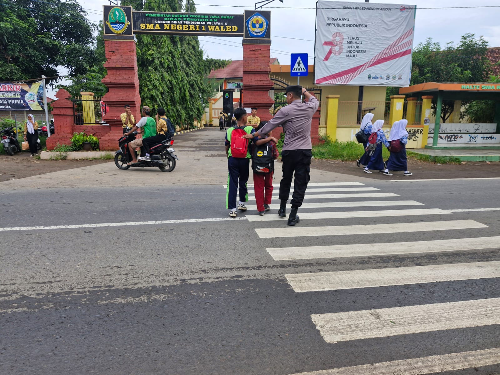 KAB. CIREBON – Personil Polsek Waled Polresta Cirebon, Memberikan rasa aman kepada pelajar, maupun warga masyarakat, serta pengguna jalan lainnya anggota Polsek Waled melaksanakan pengaturan arus lalin di pagi hari, di mana lokasinya di jalan depan SMP N.1 Waled adapun kegiatan tersebut bertujuan untuk mengantisipasi adanya kemacetan lalu lintas di pagi hari, oleh karena itu setiap hari Senin sampai dengan hari Kamis anggota Polsek Waled selalu hadir guna mengantisipasi adanya kerawanan kerawanan serta kemacetan di pagi hari.