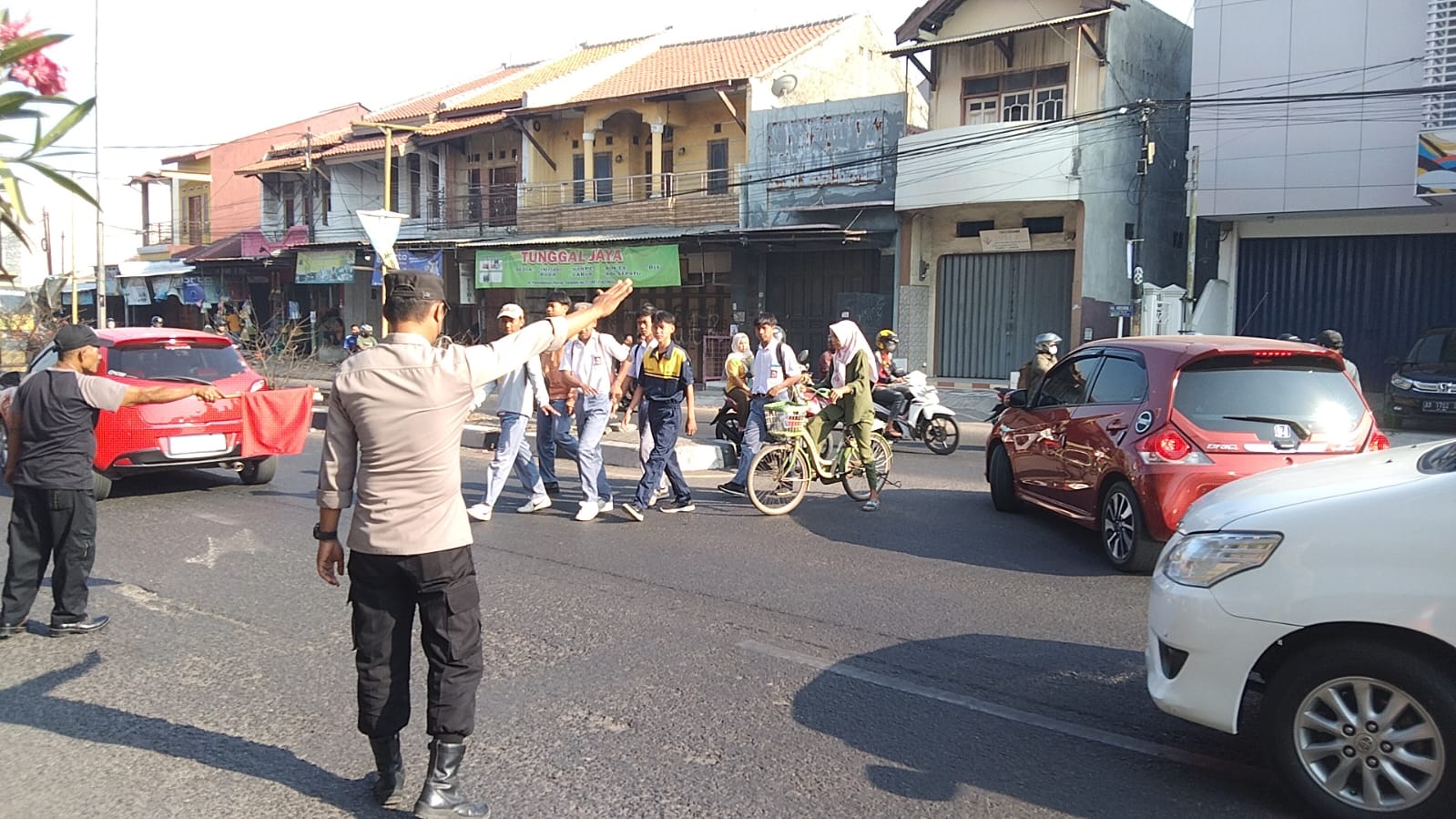 Jajaran Personil Polsek Plered Polresta Cirebon Polda Jabar, melaksanakan Gatur Lalu lintas pagi di Jaln Raya Panembahan tepatnya di depan SMK Nusantara Weru Ds. Panembahan Kec Plered Kab Cirebon.