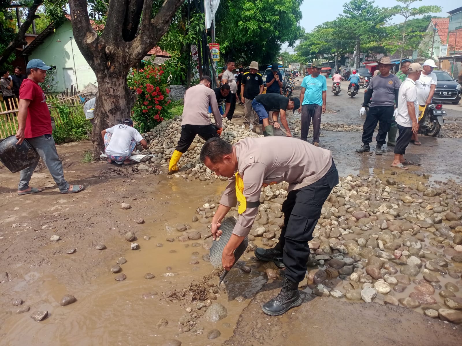 Adalah bentuk sinergitas dan kepedulian Polsek Gebang Polresta Cirebon bersama warga masyarakat agar jalan yang di lalui oleh banyak warga tersebut tidak menimbulkan kecelakaan akibat jalan yang berlubang.