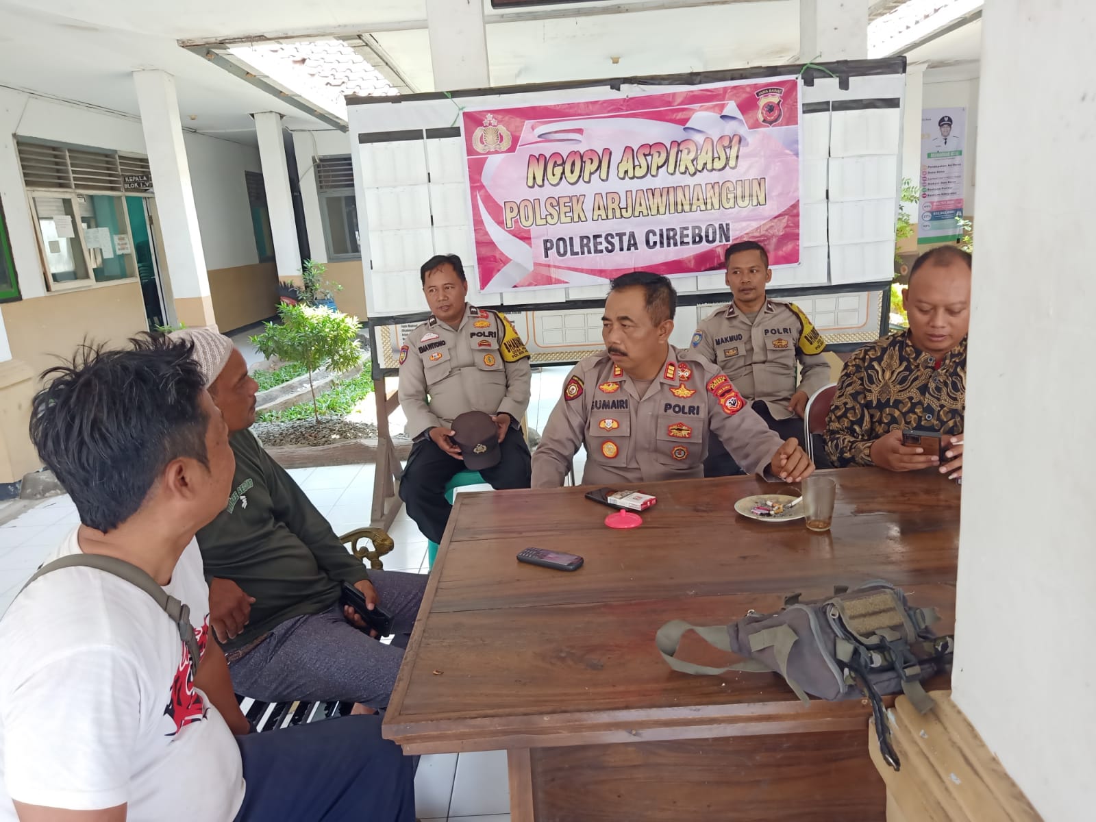Dalam kegiatan ngopi aspirasi tersebut di terima langsung oleh Kapolsek Arjawinangun AKP.Sumairi SH.M.S.i dengan mengatakan bahwa ngopi aspirasi merupakan sarana yang di berikan kepada masyarakat yang ingin menyampaikan berbagai permashalahan serta keluhan yang berkaitan dengan pelayanan Kepolisian maupun gangguan Kamtibmas yang terjadi di lingkungan masyarakat khususnya warga masyarakat Desa Tegalgubug sehingga permashalaan yang terjadi tersebut dapat di selesaikan bersama.