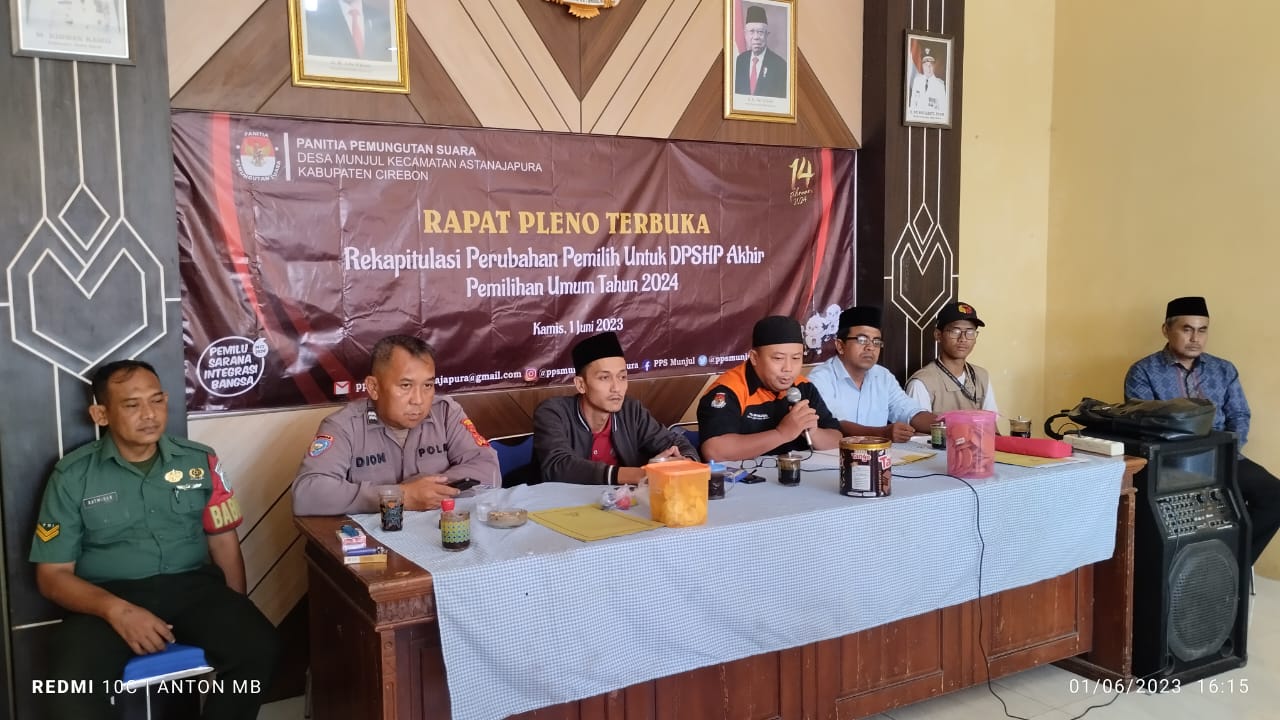 KAB.CIREBON – Bhabinkamtibmas Desa Munjul Aiptu Sudiono dan babinsa sertu katmiran bertempat di Aula Desa Munjul melaksanakan monitoring dan pengamanan Rapat Pleno Terbuka Rekapitulasi DPSHP Akhir (Daftar Pemilih Hasil Pemutakhiran) Desa Munjul yang merupakan salah satu Tahapan Pemilu Tahun 2024, Jum’at (02/06/2023).