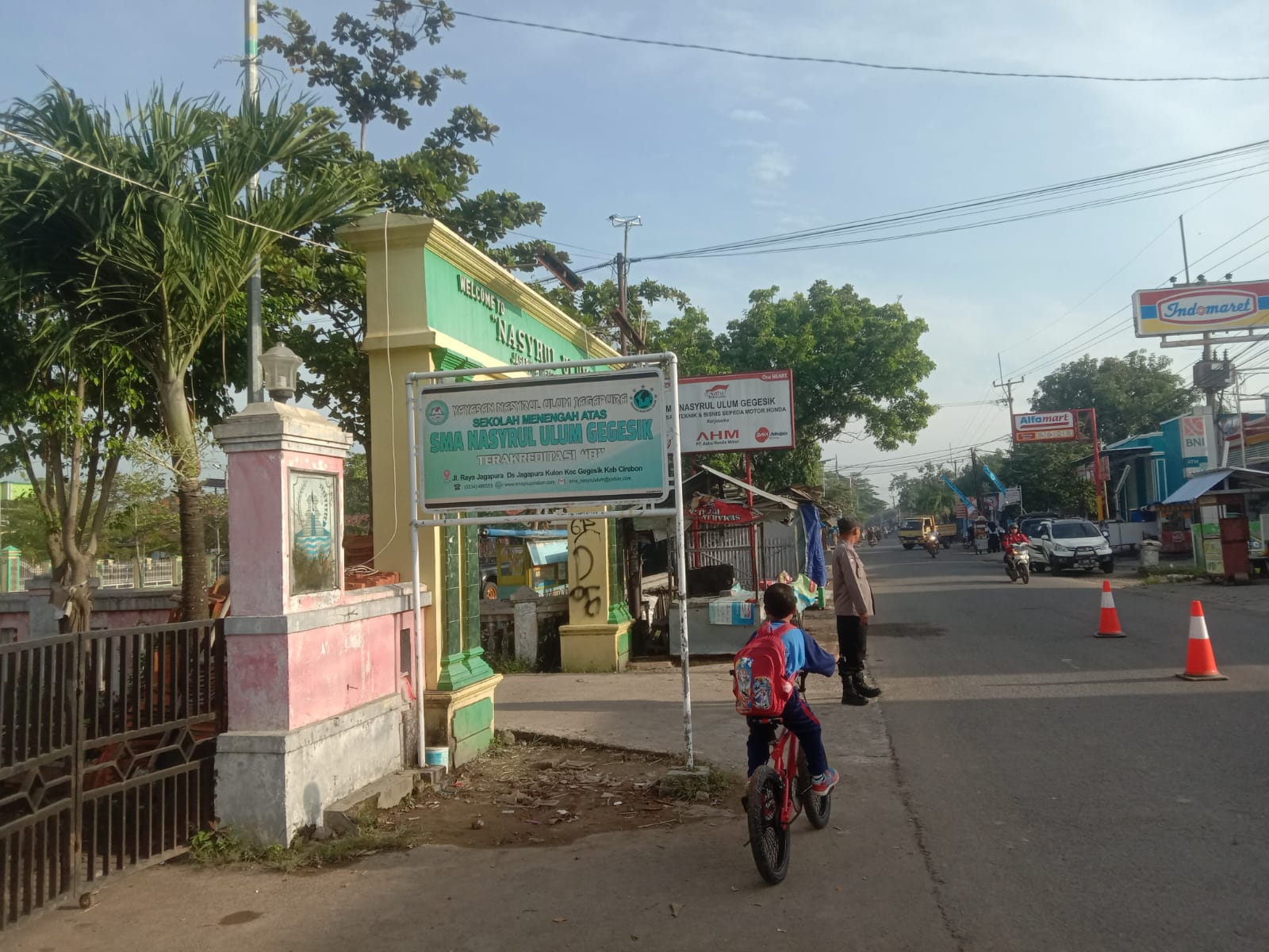 KAB. CIREBON –  Berikan pelayanan kepada masyarakat di pagi hari polsek gegesik melaksanakan pengaturan lalu lintas di depan smk Nasyrul ulum Gegesik, Jumat (10/11/2023).