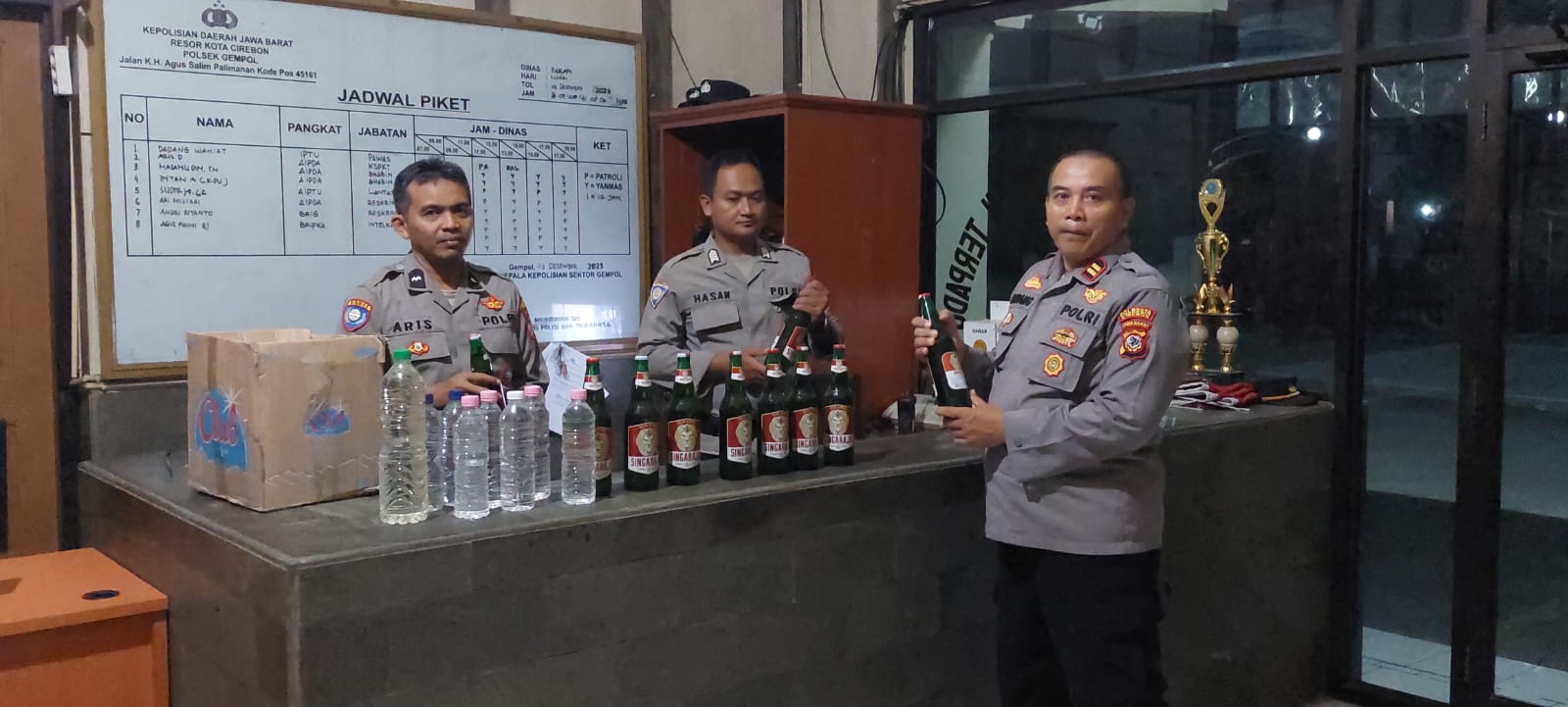Piket patroli presisi macan kumbang Polsek Gempol laksanakan operasi pekat/miras bertempat di warung Sdr.ANDI termasuk Desa Palimanan timur Kecamatan Palimanan Kabupaten Cirebon, Berhasil mengamankan 20 botol miras berbagai merk antaralain 10 botol besar bir, 2 botol besar ciu isi 1,5 Liter., 8 botol kecil ciu  isi 600 Ml.