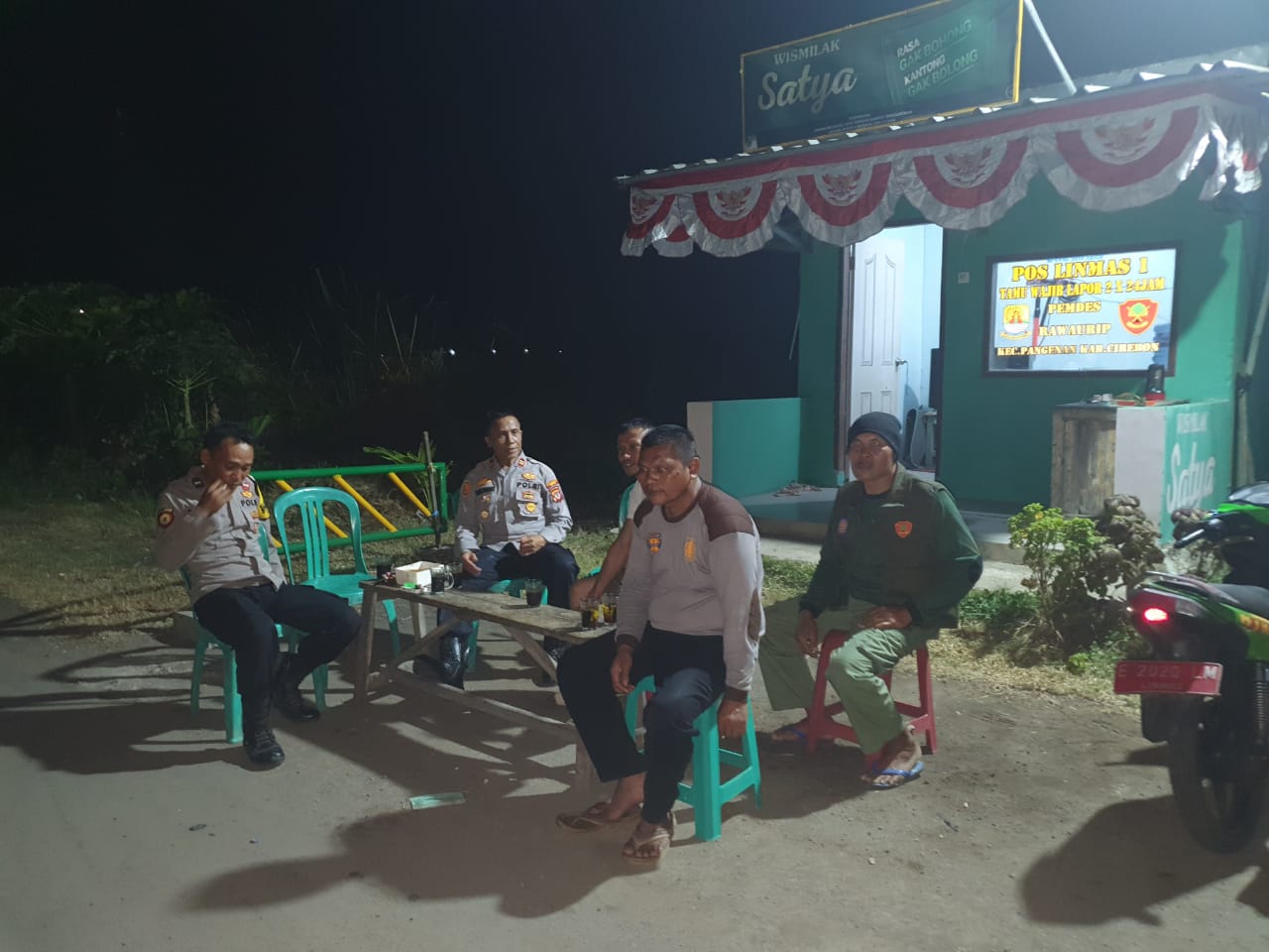 Kapolsek Pangenan IPTU SUKENDRI beserta anggota lainnya AIPDA SAPURO melaksanakan patroli sambang dialogis dengan LINMAS di Pos blok Kliwon Desa Rawaurip sampaikan pesan kamtibmas. (28/10/2023).