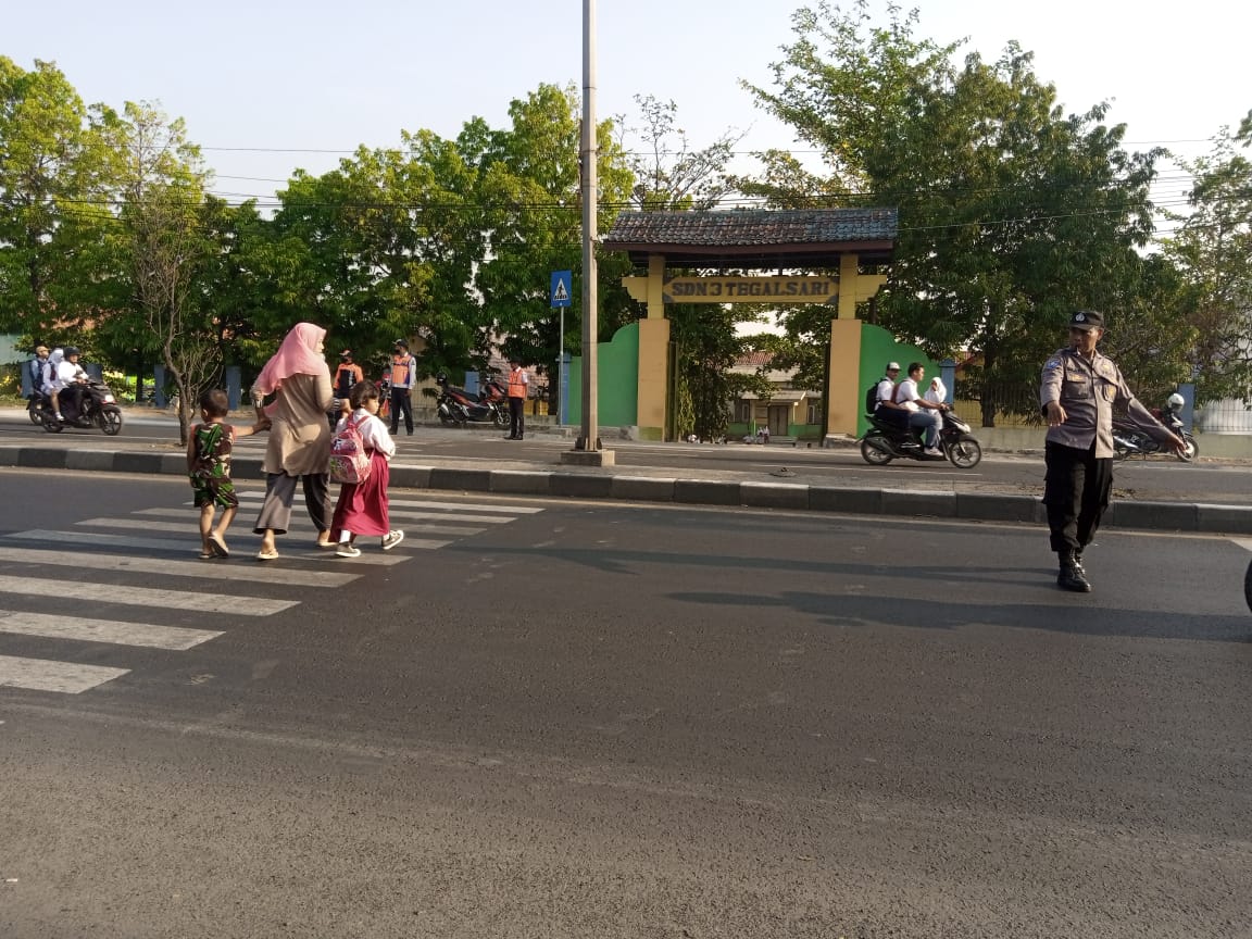 Jajaran Personil Polsek Plered Polresta Cirebon Polda Jabar, melaksanakan Gatur Lalu lintas pagi di Jaln Raya Otista tepatnya di depan SDN3 Tegalsari dan SMPN 2 Plered Ds. Tegalsari Kec Plered Kab Cirebon.