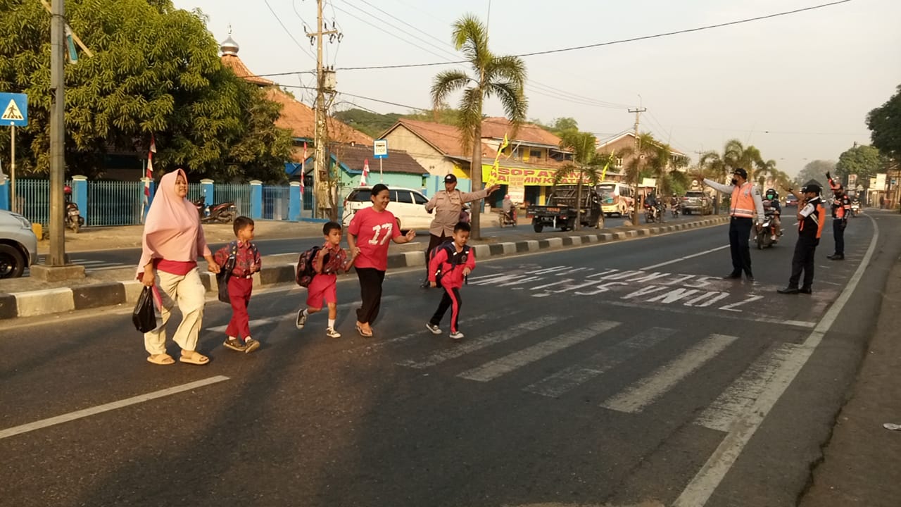 Pelaksanakan Gatur Lalu lintas pada pagi hari di Jaln Raya Otista tepatnya di depan SDN3 Tegalsari dan SMPN2 Plered Ds. Tegalsari Kec Plered Kab Cirebon.