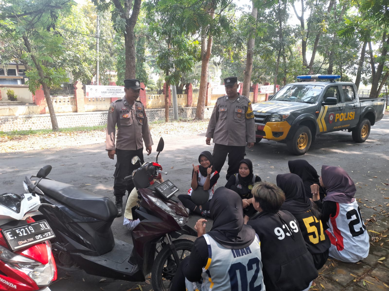 KAB.CIREBON – Patroli Polsek Sumber terdiri dari Aipda Kata dan Bripka Ady memberikan edukasi dan himbauan kepada remaja putri yg sedang berkumpul usai latihan basket di sekitaran perkantoran pemKab Cirebon, Jum’at (02/06/2023).