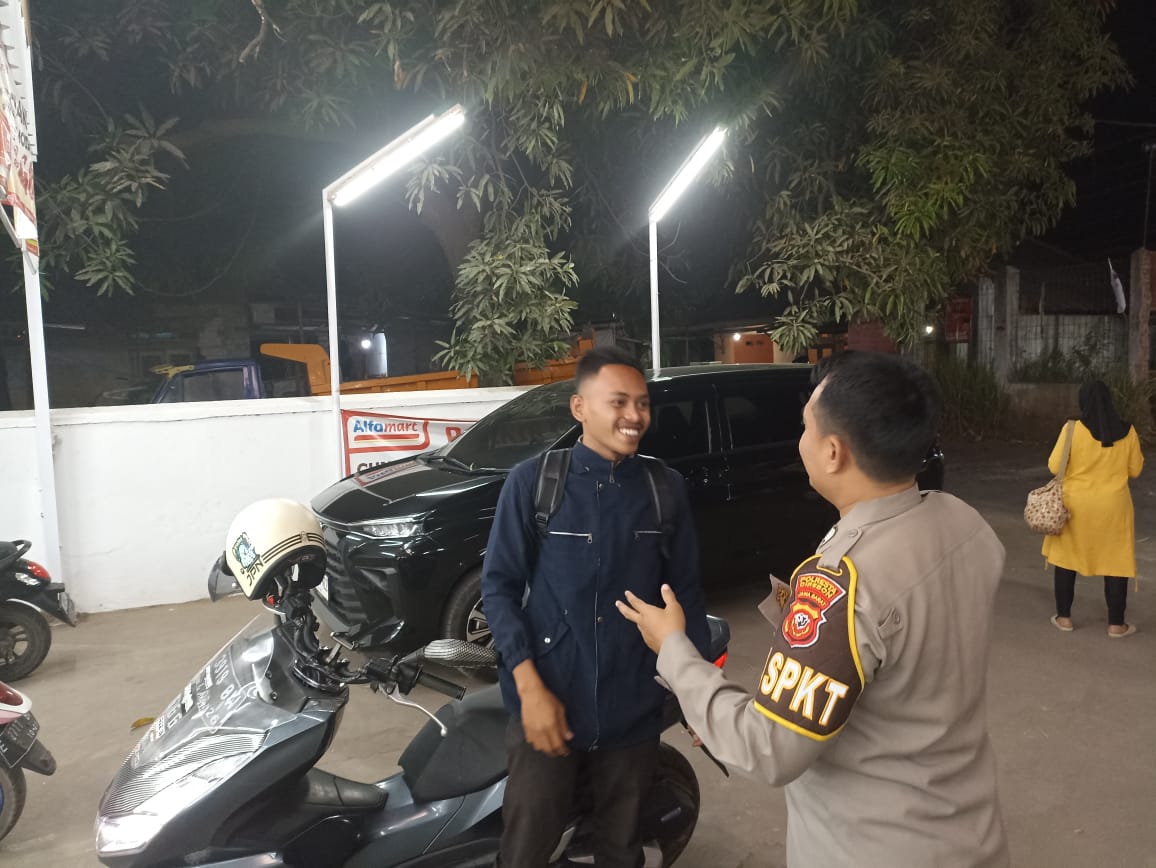 Giat Kepolisian dlm rangka cegah tangkal gangguan Kamtibmas, antisipasi C3, Genk motor dan tawuran menyampaikan himbauan kamtibmas dan mengajak berperan aktif memberikan informasi kamtibmas kepada pengunjung alfamart, warga dan anak-anak muda yang nongkrong agar segera membubarkan diri .