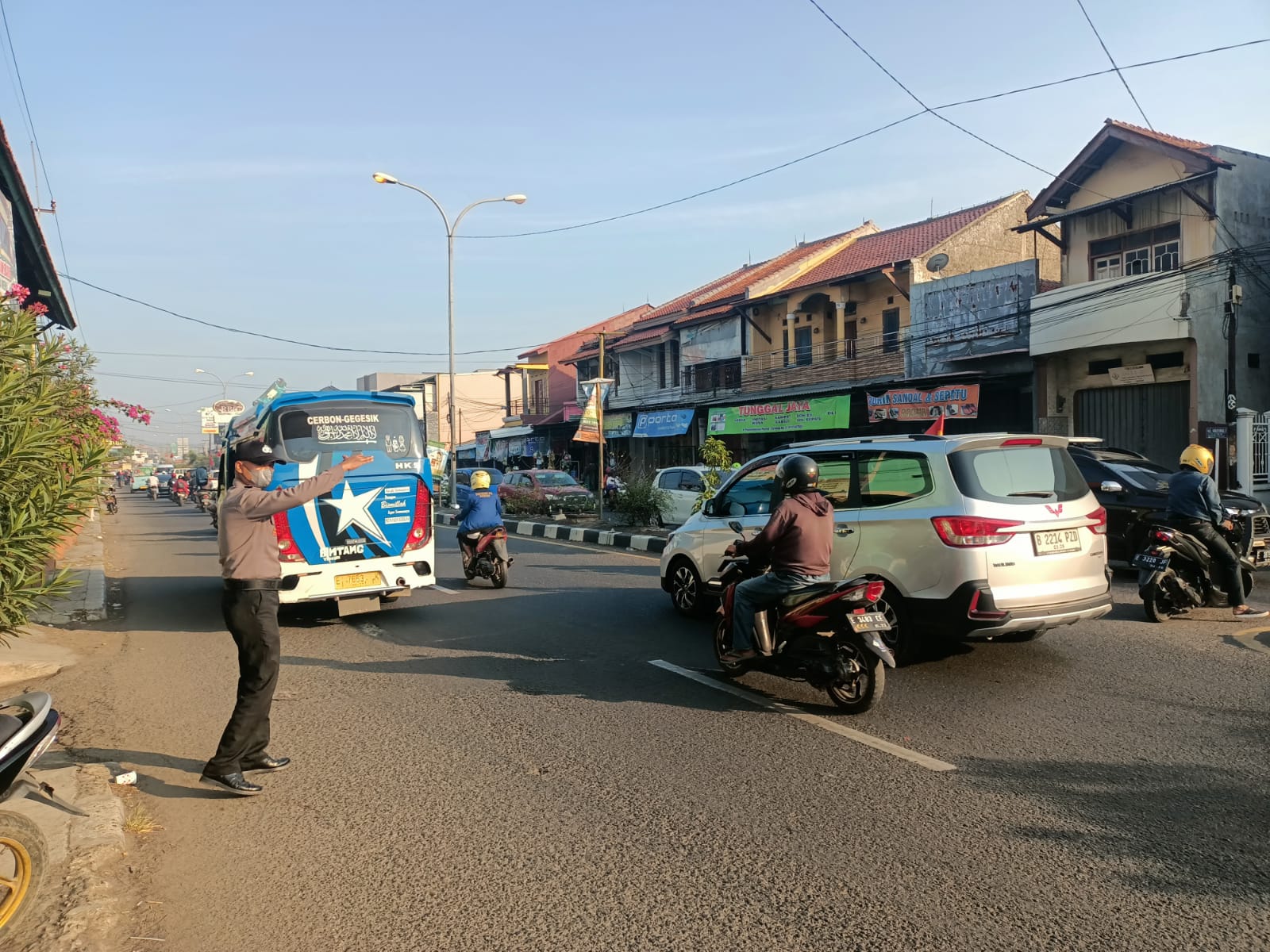 Jajaran Personil Polsek Plered Polresta Cirebon melaksanakan Gatur Lalu lintas pagi di Jalan raya Plered Jln. Otista tepatnya depan SDN3 Tegalsari dan SMPN2 Plered Ds. Tegalsari Kec Plered Kab Cirebon