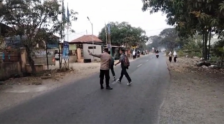 Personil Polsek Panguragan Polresta Cirebon melaksanakan Gatur Lalu lintas pagi hari di Jalan Nyimas Gandasari tepat nya di Depan Smp 1 Panguragan Kec. Panguragan Kab. Cirebon