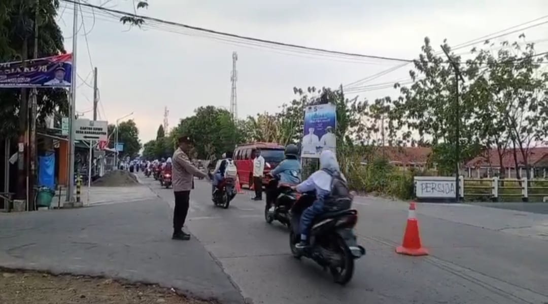 Personil Polsek karangsembung Polresta Cirebon melaksanakan Gatur Lalu lintas pagi di Jalan Karangwareng Kec. Karangwareng Kab. Cirebon