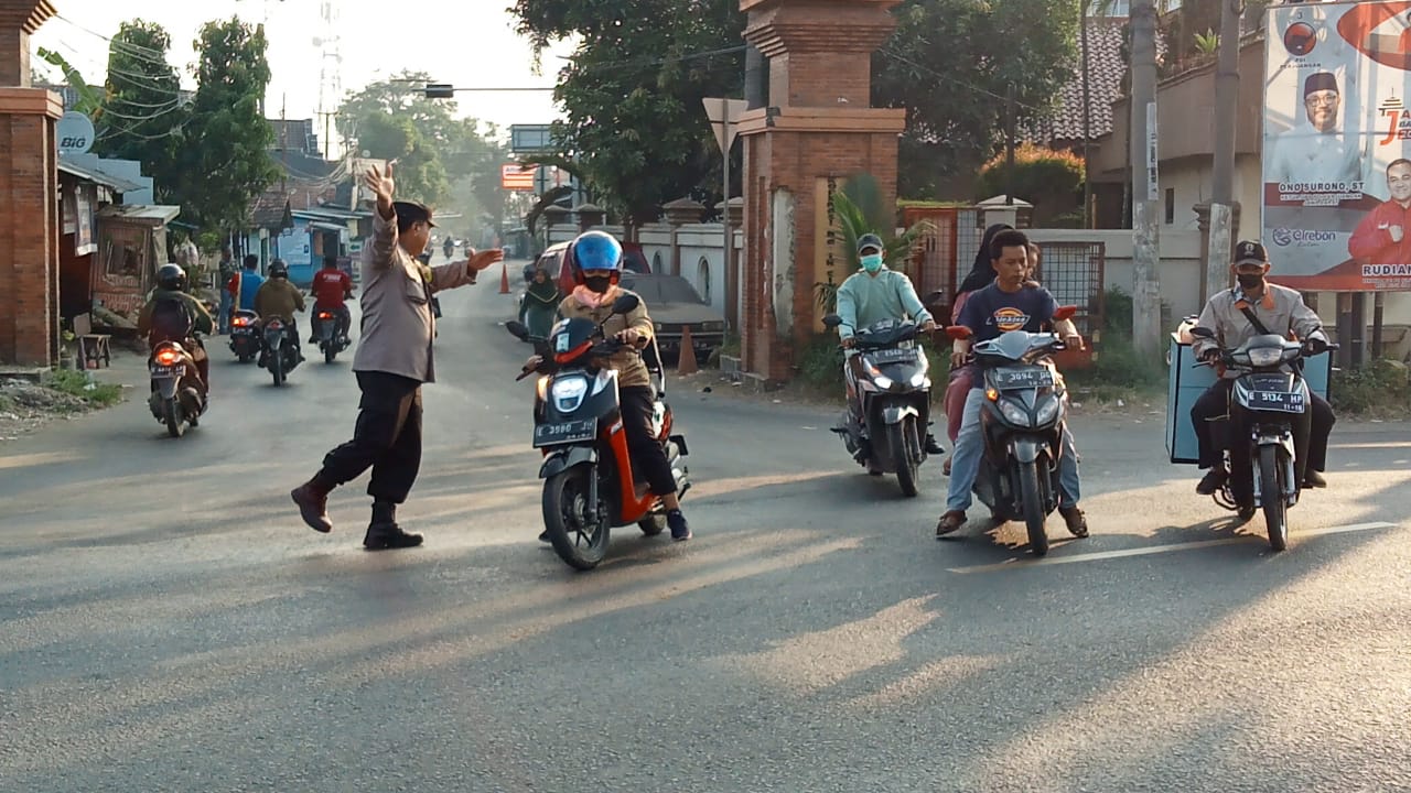 Personil Polsek Ciwaringin melaksanakan Gatur Lalu lintas di pagi hari Oleh piket Polsek Ciwaringin Ka Spkt 2, Aipda Frans bersama Bhabinkamtibmas Aiptu H. As’ary, di jalan Raya Cirebon-Bandung tepatnya di pertigaan RS, Sumber waras, Desa Ciwaringin Kec. Ciwaringin Kab. Cirebon.