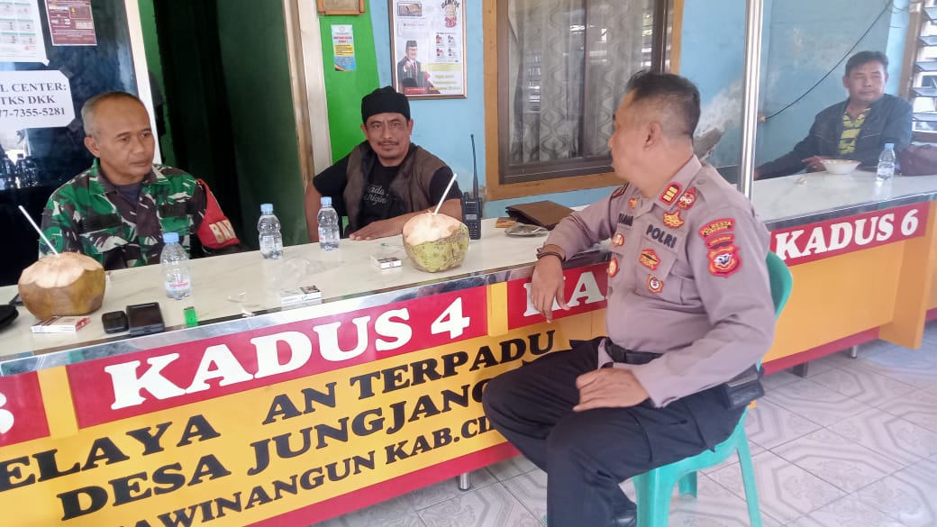 Arjawinangun, Guna memelihara Kamtibmas yang aman kondusip khususnya di wilayah hukum Polsek Arjawinangun, Kapolsek Arjawinangun Polresta Cirebon AKP.Sumairi SH.M.Si mengadakan silahturahmi Kamtibmas ke Desa Jungjang, dalam kegiatan jalin silahturahmi tersebut di terima baik oleh Kuwu Jungjang sdr.Kasmin bersama perangkat Desanya, sebagai Kapolsek Arjawinangun yang baru tentunya harus mengetahui secara langsung situasi dan kondisi wilayah hukumnya, oleh karena itu Kapolsek Arjawinangun me gadakan kegiatan tersebut dengan maksud dan tujuan untuk mengenal lebih dekat lagi serta jalin silahturahmi dengan Kuwu serta perangkat Desanya dan dalam kesempatan tersebut menyampaikan pesan pesan Kamtibmas guna menciptakan situasi yang aman kondusip.