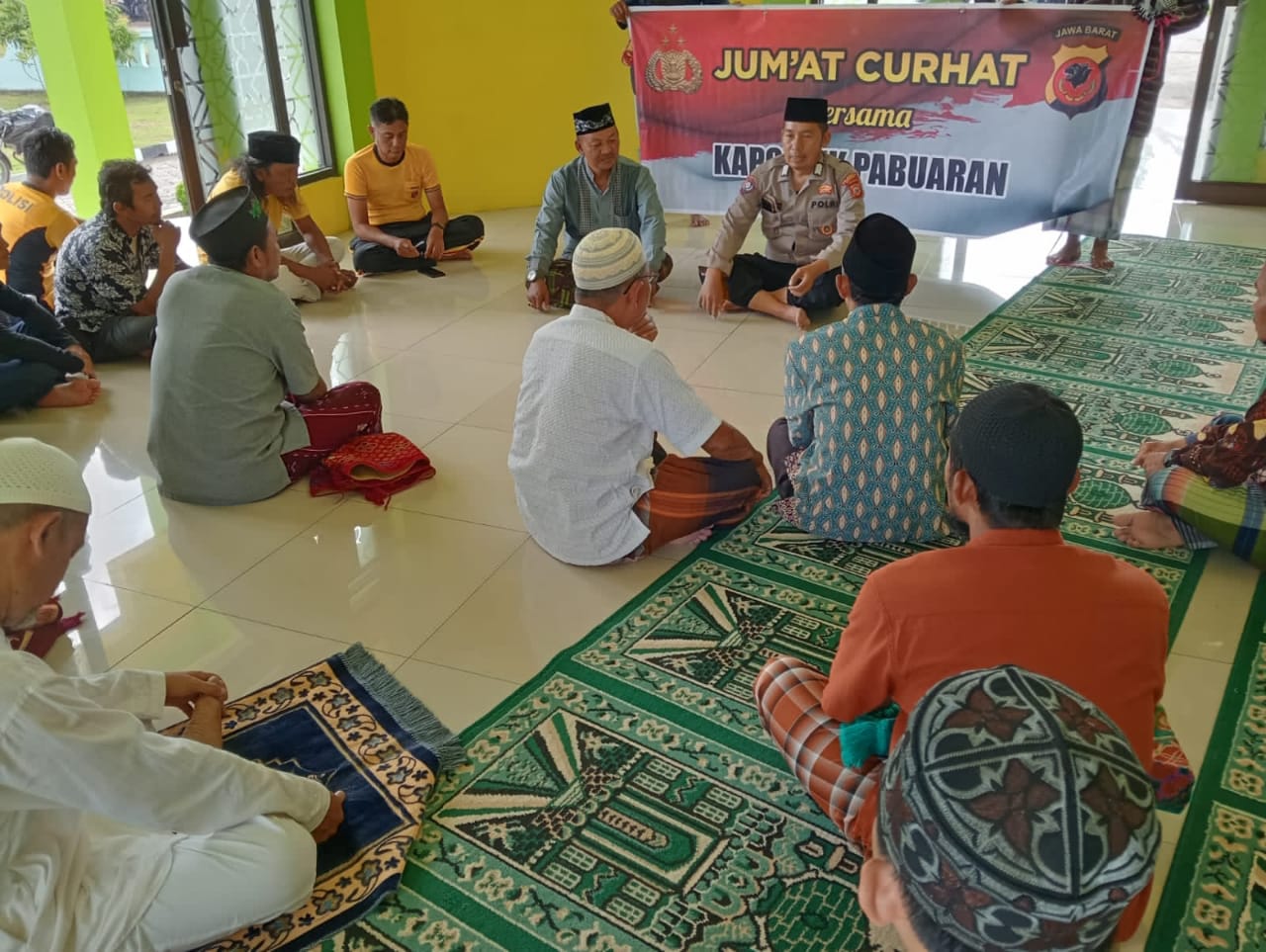 PABUARAN KAB. CIREBON. Jum’at 02/02/2024, AKP Moch. Soleh, SH. selaku Kapolsek Pabuaran Polresta Cirebon Polda Jabar, yang pada kesempatan ini diwakili oleh Ps. Kanit Binmas Bripka Usyanto, SH melaksanakan silaturahmi dan ajak jaga Kamtibnas dan mendengarkan saran masukan dari Tokoh Agama dan masyarakat melalui program Jumat Curhat di Masjid Bubuk Wathon Desa Pabuaran Wetan Kec. Pabuaran Kab. Cirebon.