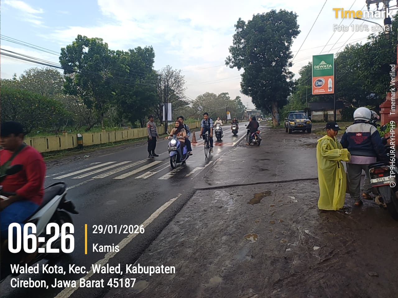 Kegiatan yang dimulai pukul 06.00 WIB ini dipimpin oleh Kanit Samapta Polsek Waled, Aiptu P. Agung J., didampingi dua personel lainnya. Fokus utama giat ini adalah memastikan kelancaran arus kendaraan sekaligus membantu penyeberangan anak sekolah dan warga yang mulai beraktivitas di wilayah hukum Polsek Waled.