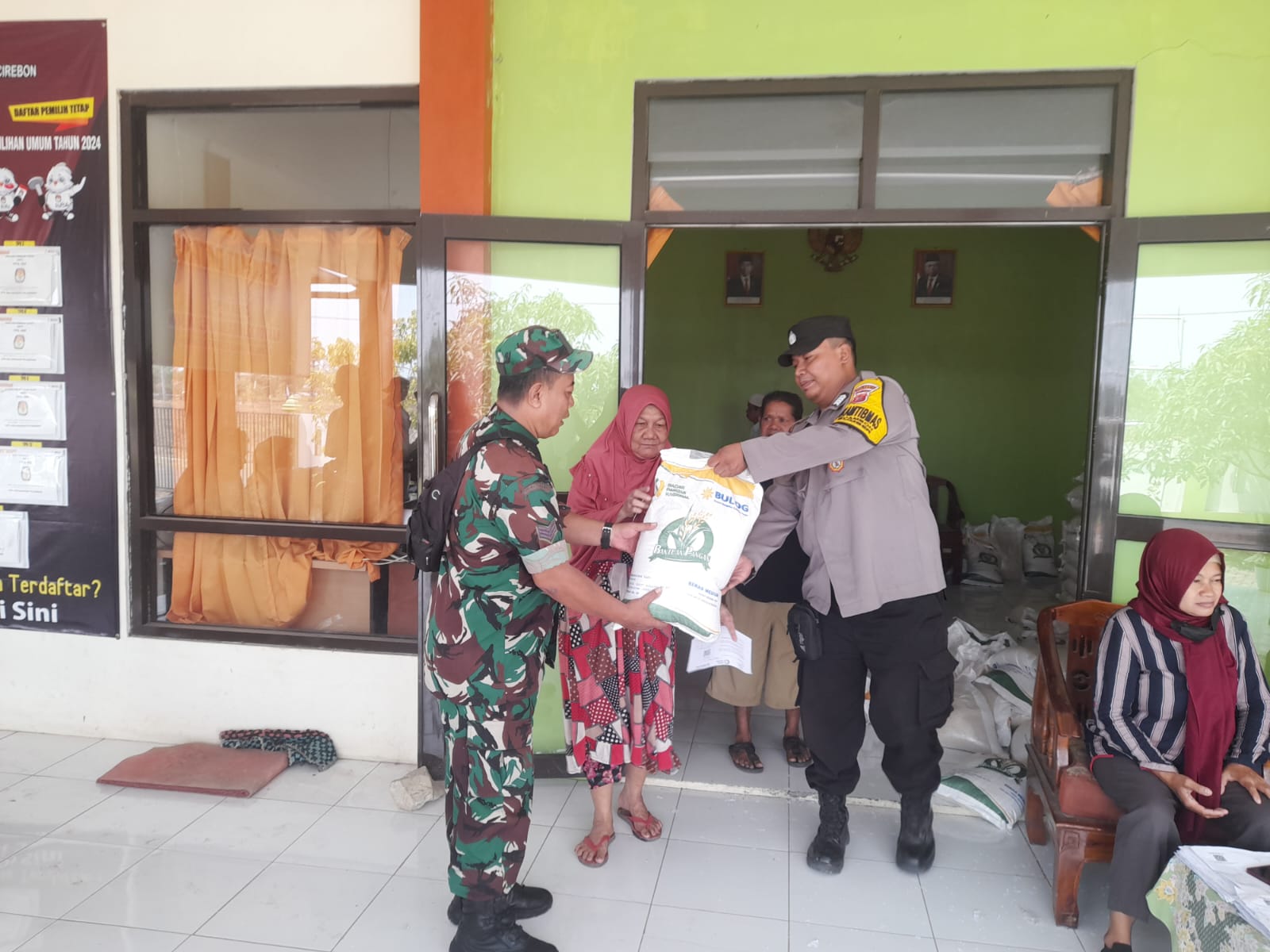 KAB. CIREBONĀ – Bhabinkamtibmas Kel Pejambon Polsek Sumber Polresta Cirebon Bripka Ady.S bersama Babinsa melaksanakan pengamanan dan pendampingan penyaluran bantuan sosial berupa beras dari Badan Pangan Nasional di kantor Kel.Pejambon termasuk Kec Sumber Kab Cirebon Senin (7/05/2024).